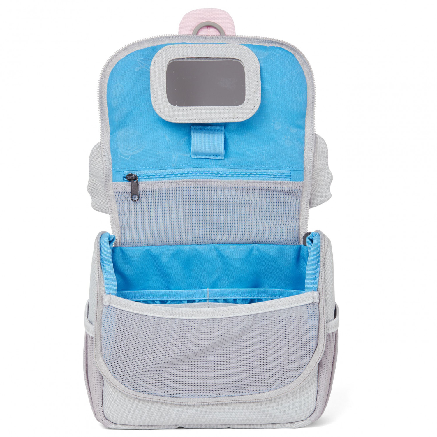 - pull-out tongue with name tag; embroidered details; hidden hook; mirror; toothbrush holder