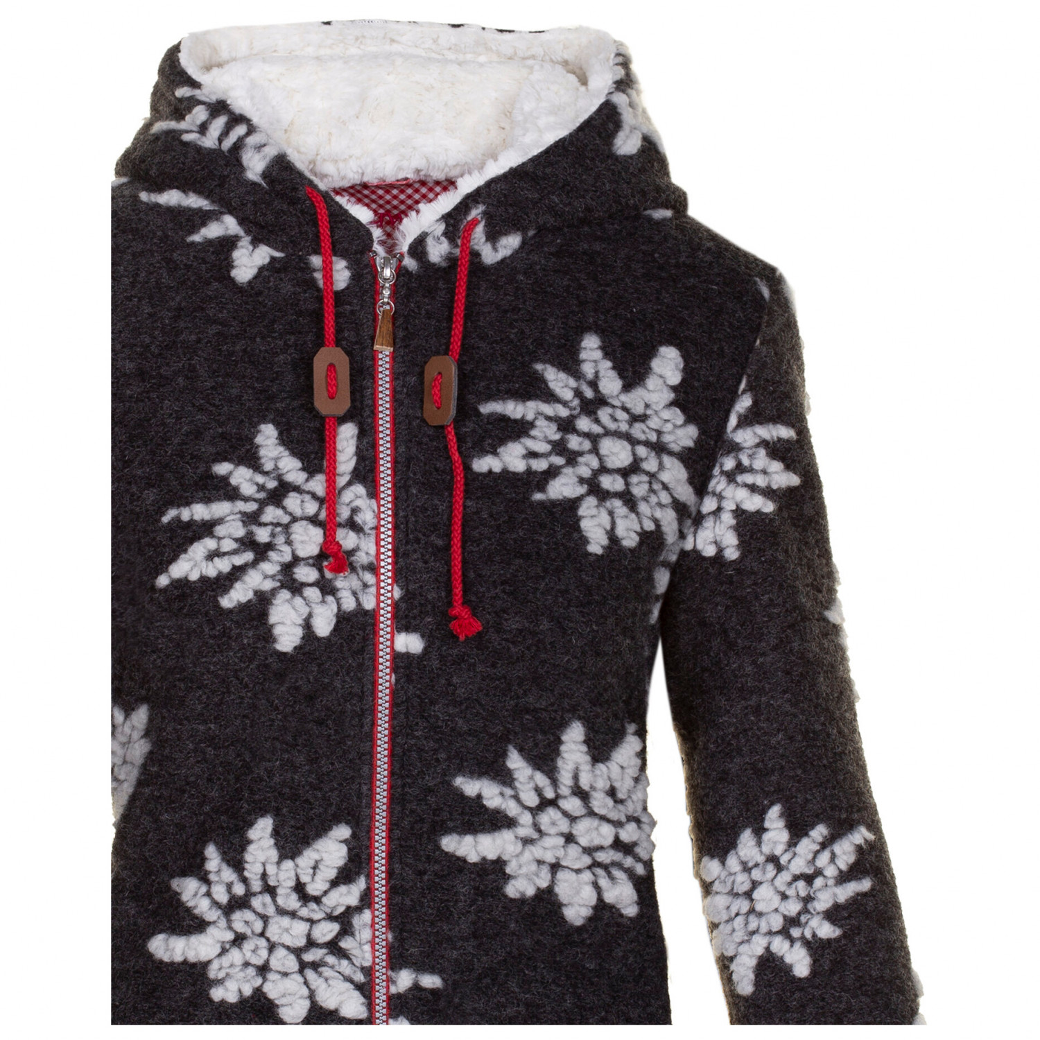 - staghorn details; hood with teddy plush lining