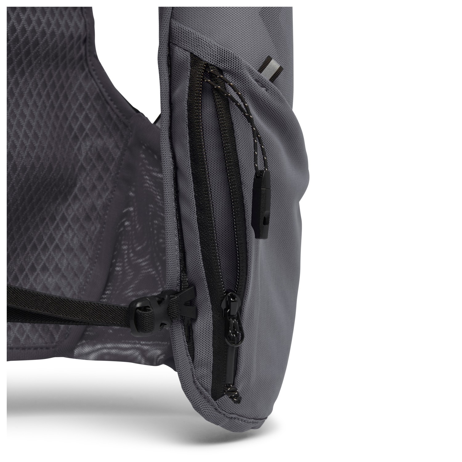 - 2 flaskhållare, 2 framfickor med blixtlås, sidoficka med blixtlås, nyckelclip, förvaringsfack på baksidan