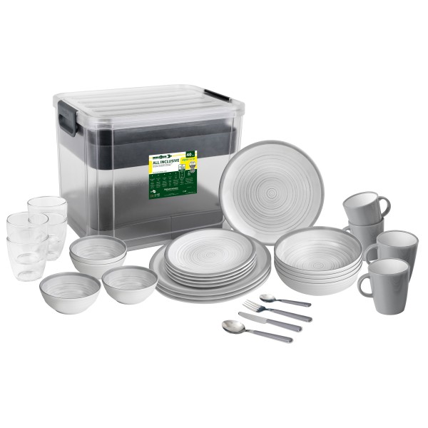 - tallrikar: 4 st. stora 26 cm, 4 st. små 21 cm, 4 st. djupa 21 cm; skål: 4 st. 15 cm; Koppar; 4 st. 30 cl; muggar: 4 st. 20 cl; bestick-set: 4 x kniv, gaffel, sked, tesked