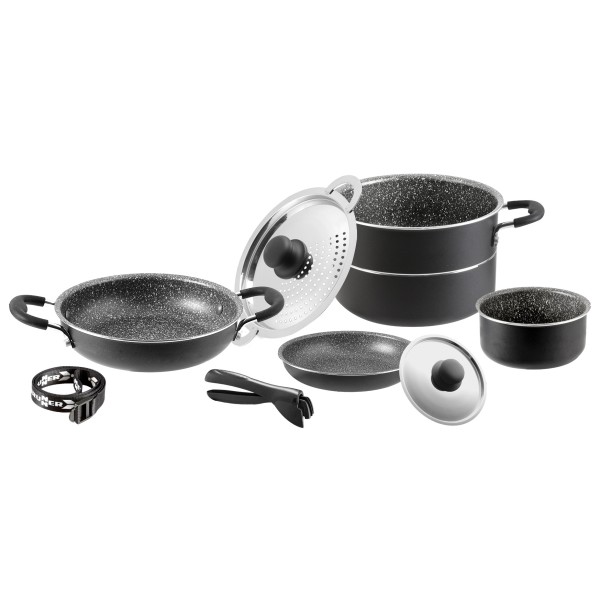 - 1 stor kastrull (20 cm, 4l); 1 liten kastrull (16 cm, 1,6l); 1 stor stekpanna (20 cm, 1,5l); 1 liten stekpanna (18 cm, 1l); 1 lock (18 cm); 1 lock med sil (20 cm); 1 handtag
