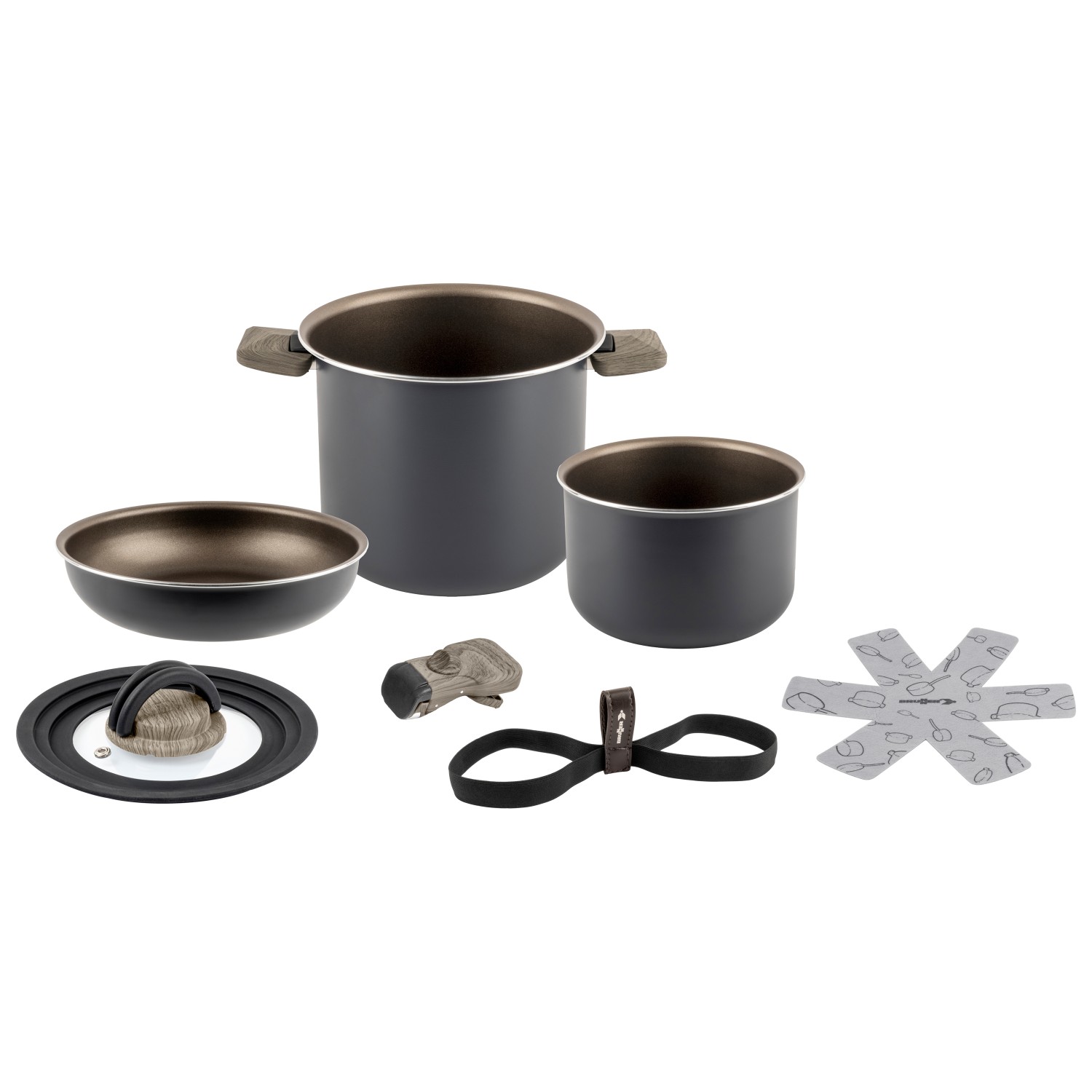 - kastrull 18 x 13 cm; kastrull 14 x 10 cm; stekpanna 18 x 5 cm; lock; handtag till stekpanna