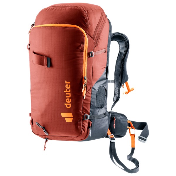 - materialöglor på höftselen, lavinväska, innerficka med blixtlås, hållare för lina, fickor för höftselar, skid-/snowboardhållare, hjälmhållare, isyx-/stavhållare, glasögonfack, värdefack