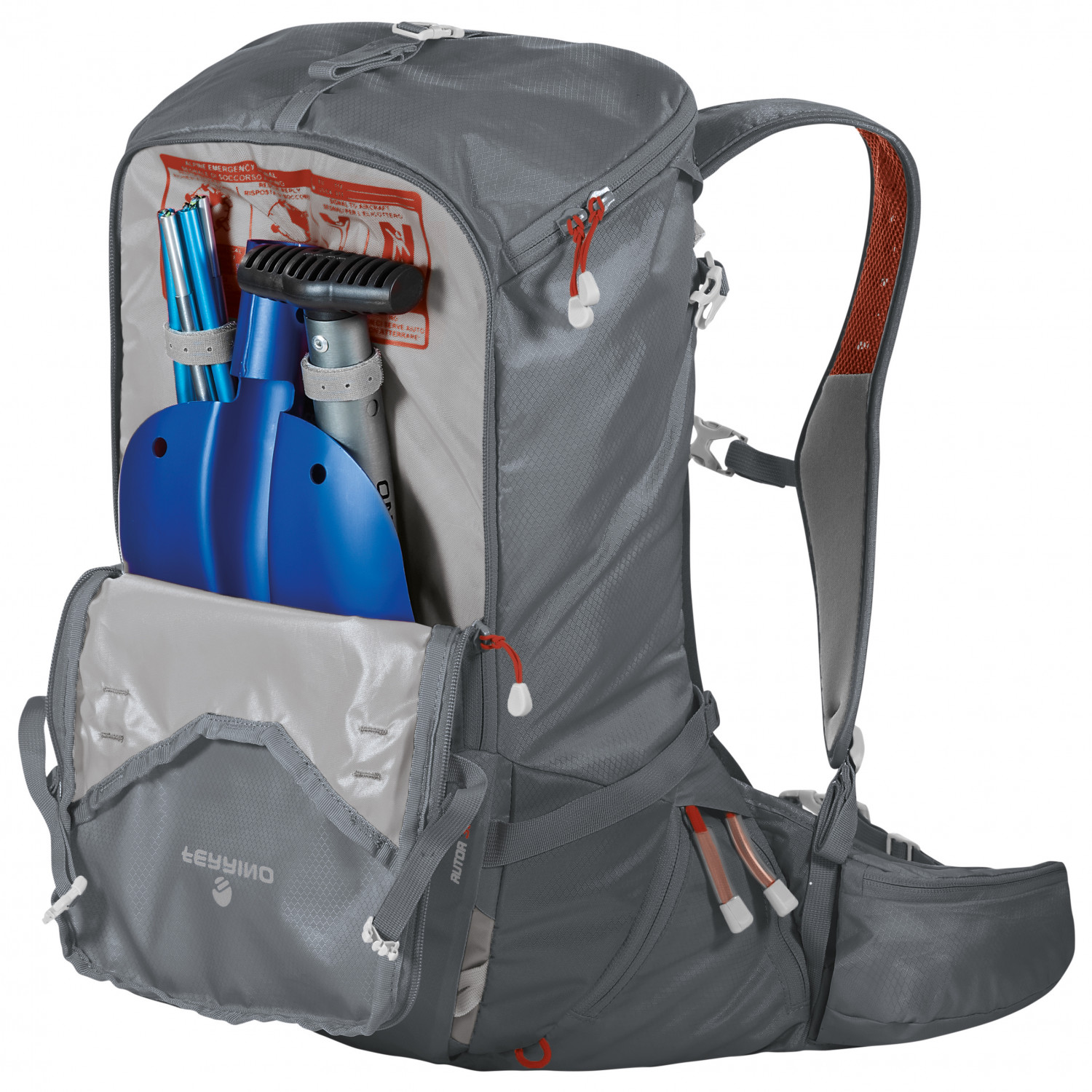 - avtagbart fack med lock, bottenfack, daisy chain, fack fram, fickor för höftselar, lavinväska, materialöglor på höftselen, hållare för lina, skid-/snowboardhållare, förvaringsfack på baksidan, stegjärnsfack, ficka på axelremmen