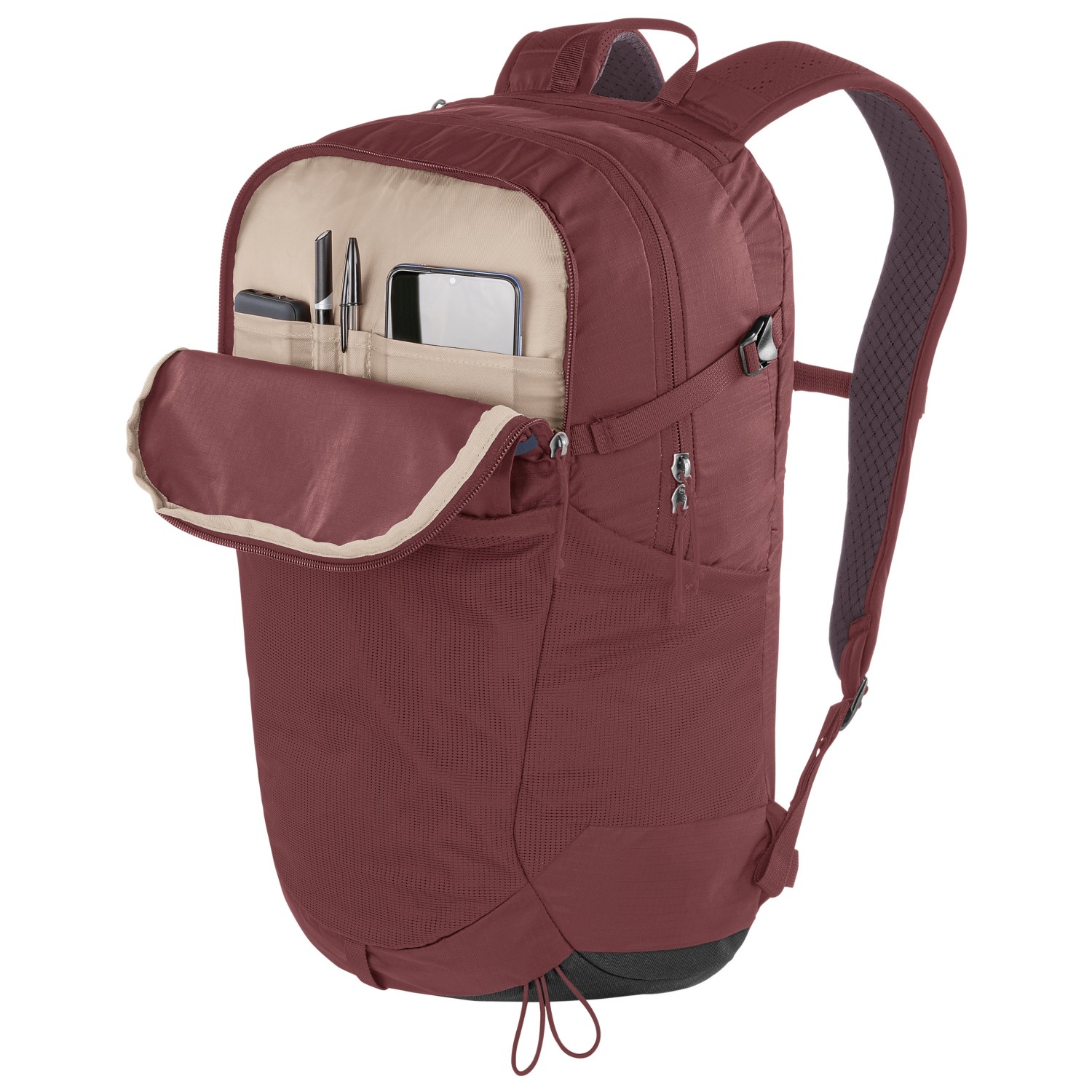 - 2 sidofickor, fäste för trekkingstavar, laptopfack (15"), framficka med blixtlås