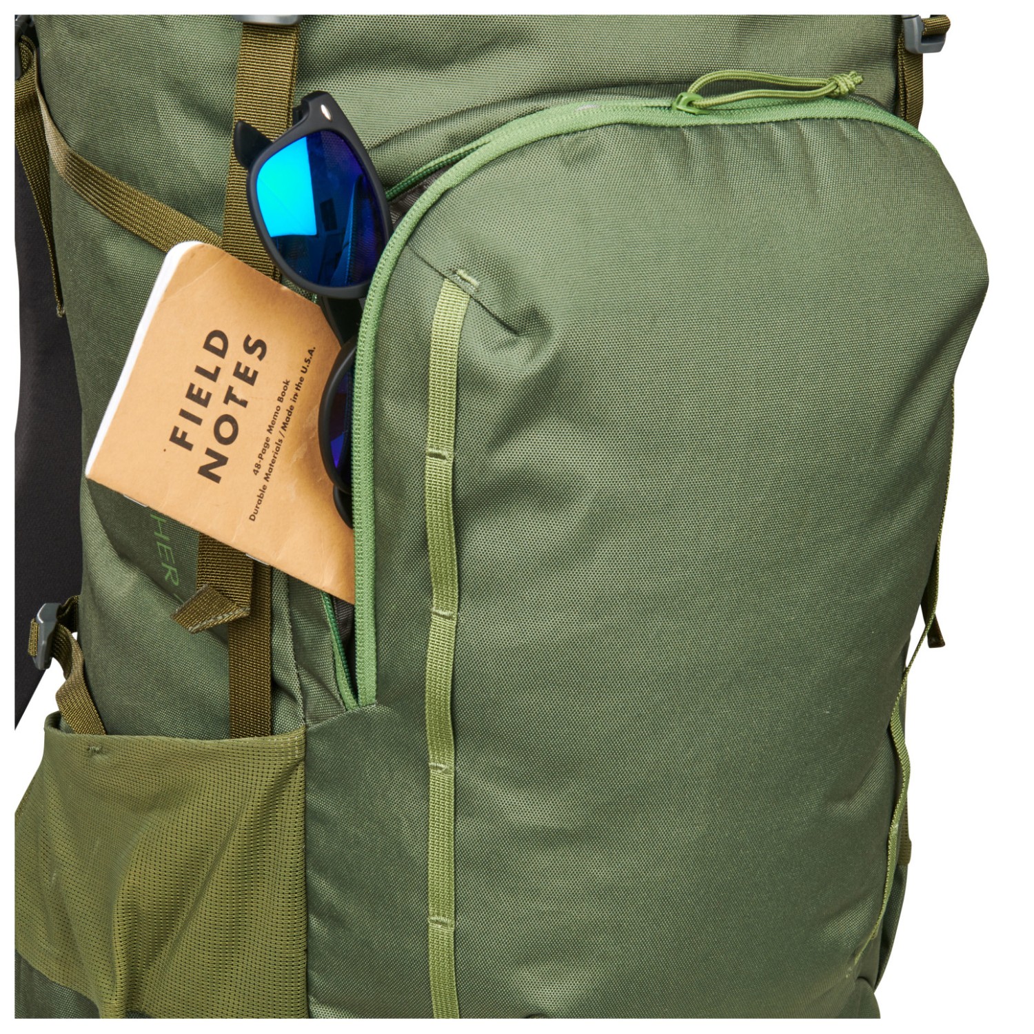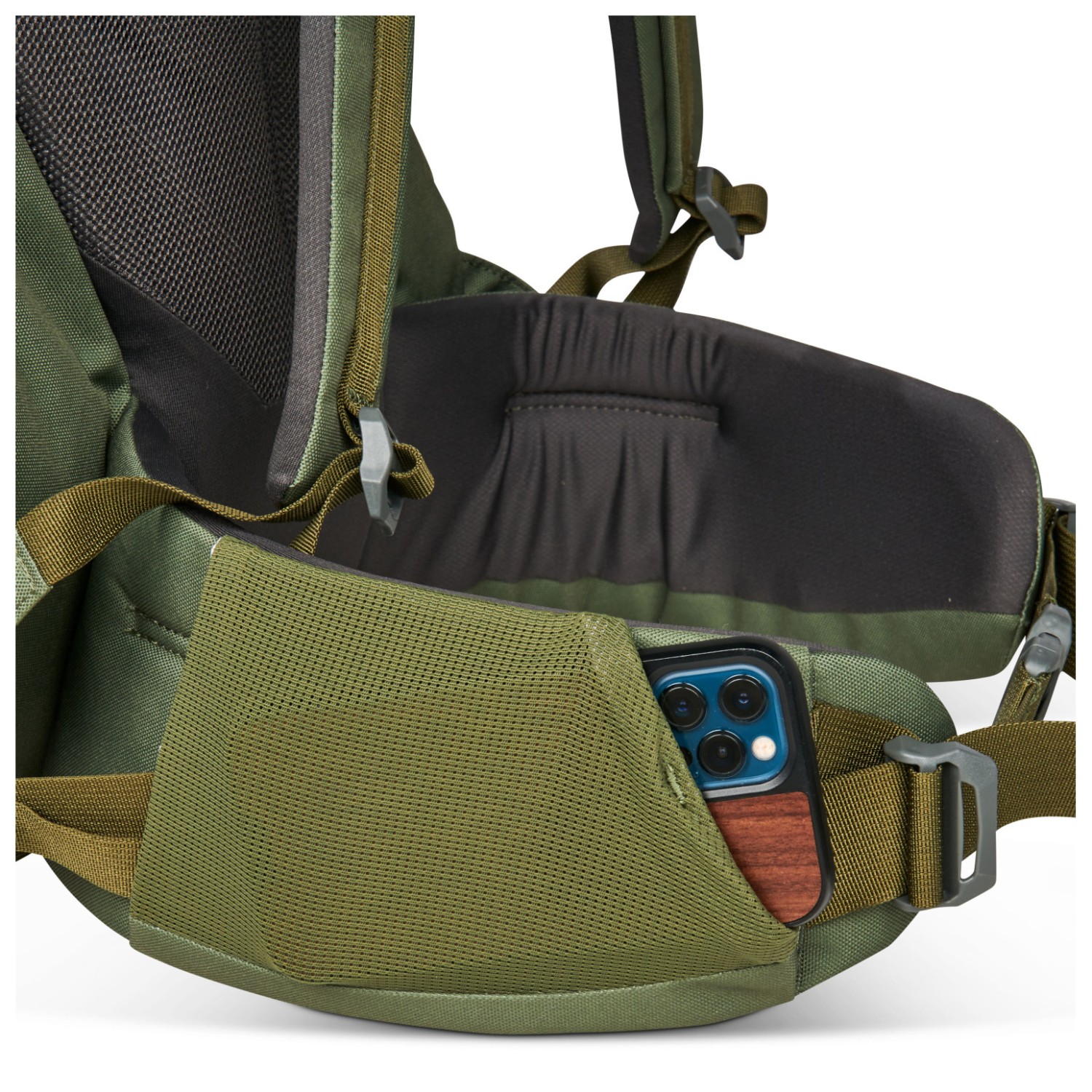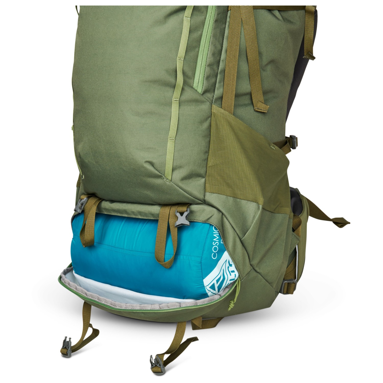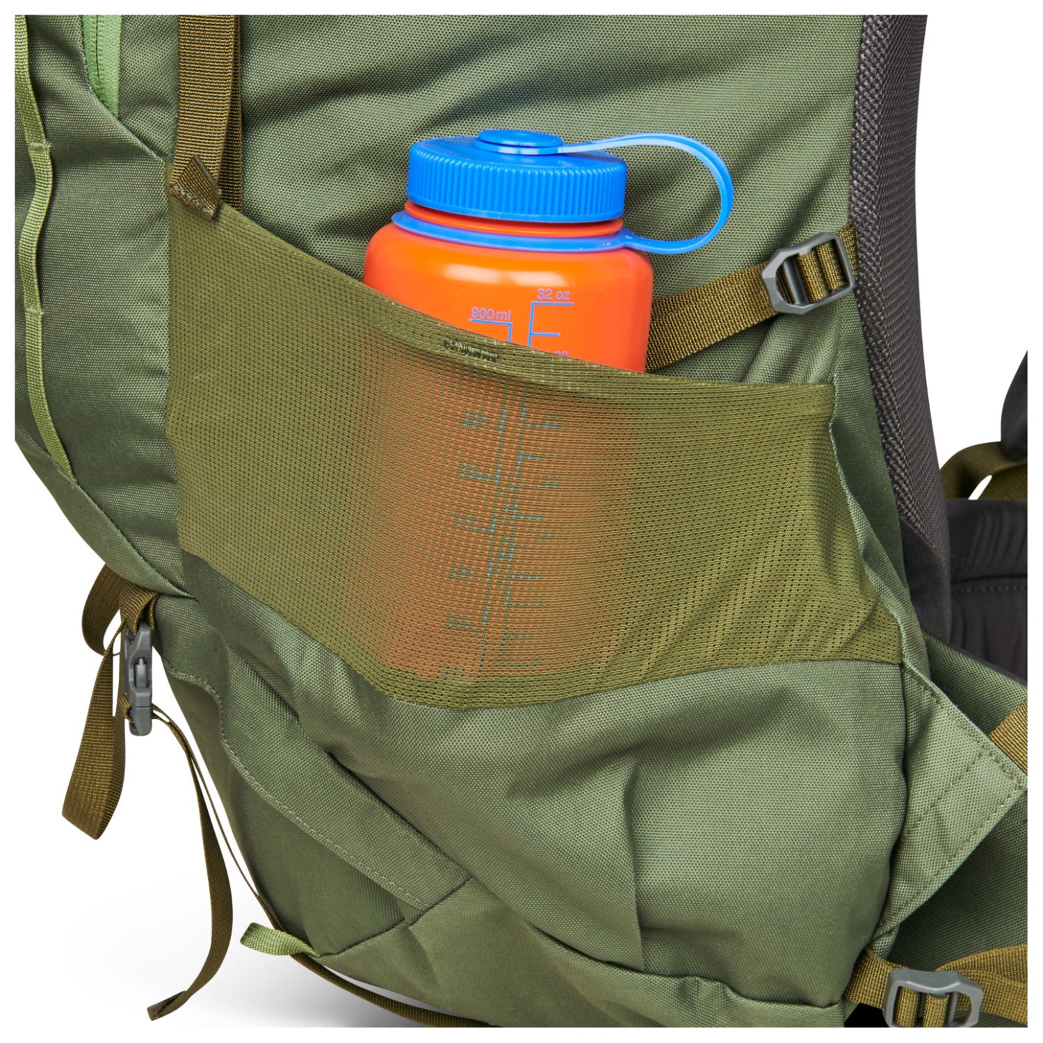 - 2 meshfack på sidan, fäste för trekkingstavar, fack fram, fickor för höftselar, sovsäcksfack