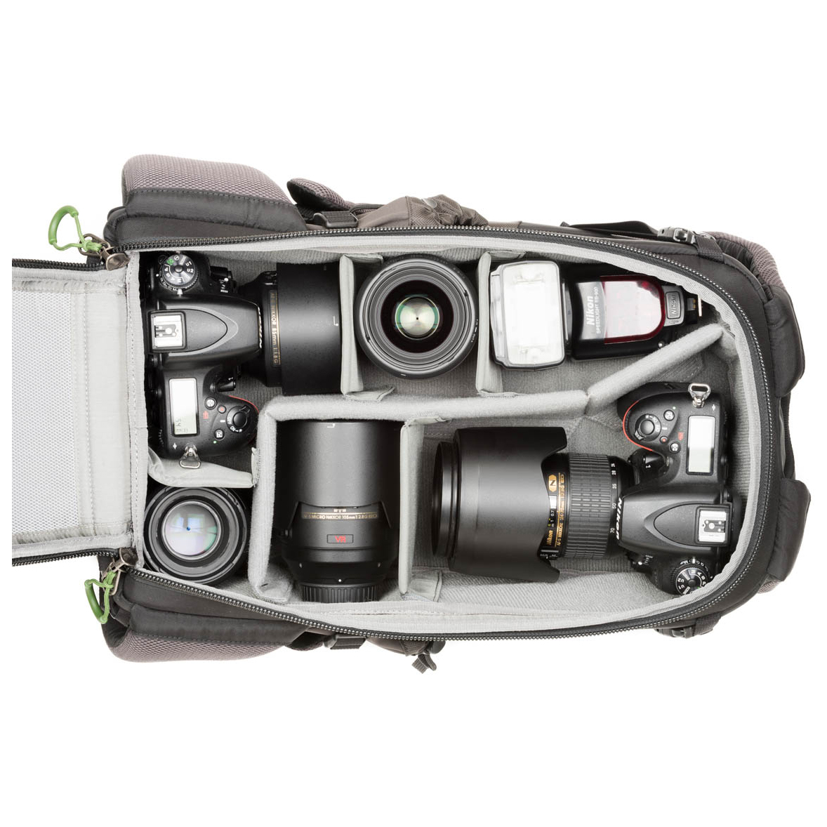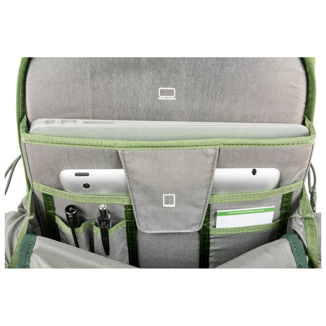- 2 sidofickor, daisy chain, isyx-/stavhållare, fack fram, laptopfack (13"), meshinnerfack, hållare för baklampa, blixtlåsficka, stativhållare