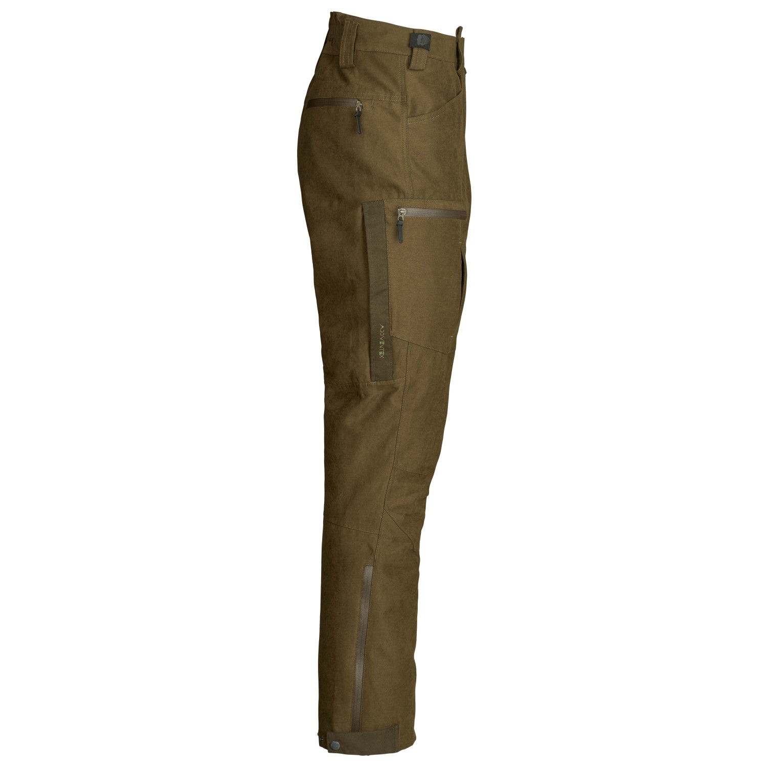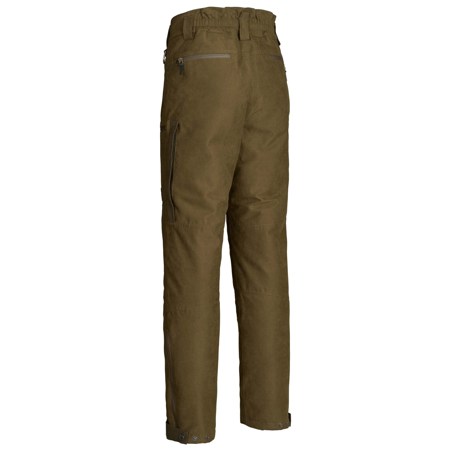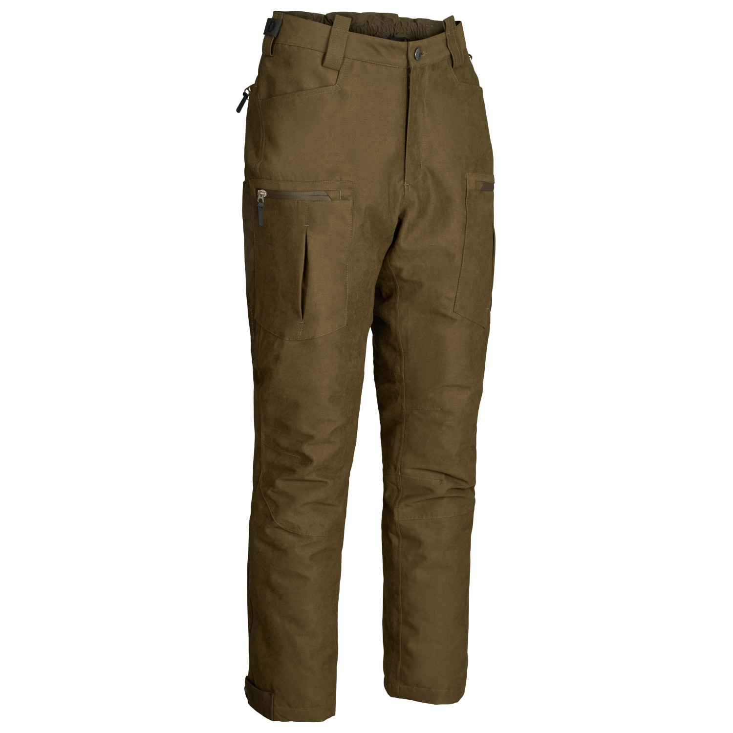 - elastisk linning, bältesöglor, blixtlås i bensluten, förformade knän, vattenavvisande blixtlås