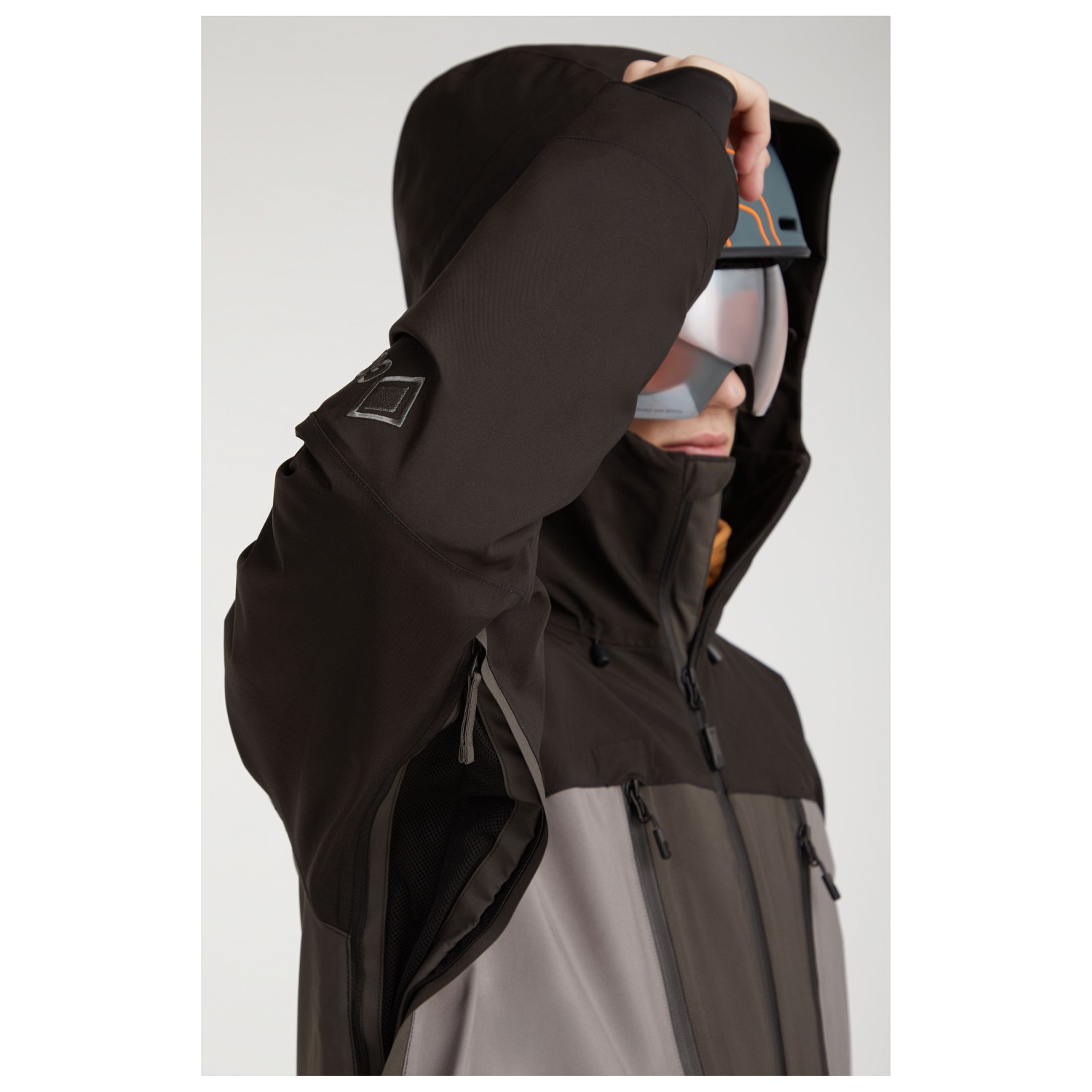 - tumhål, damasker i ärmsluten, jack-byx-anslutningssystem, tryckt logotyp, snölås, reglerbara ärmmuddar, reglerbar midja