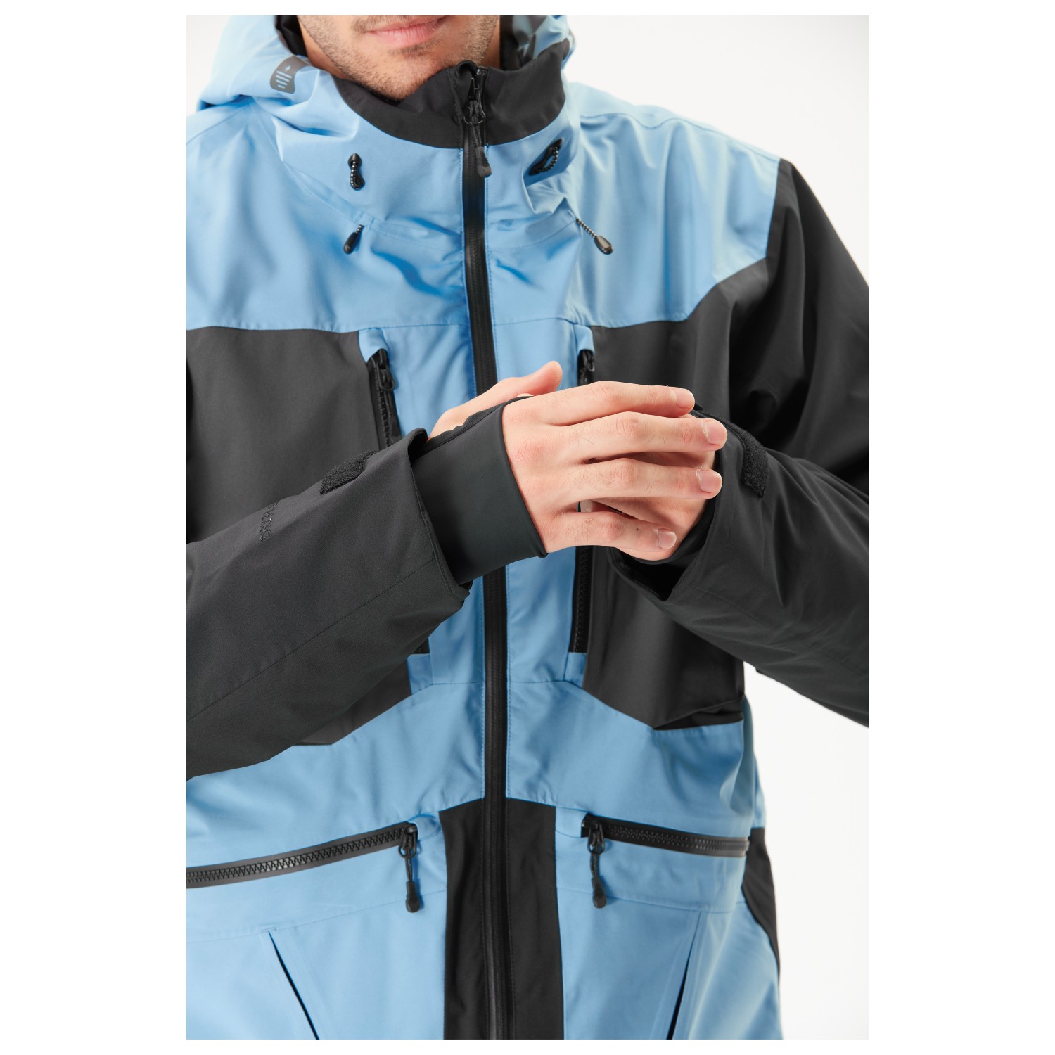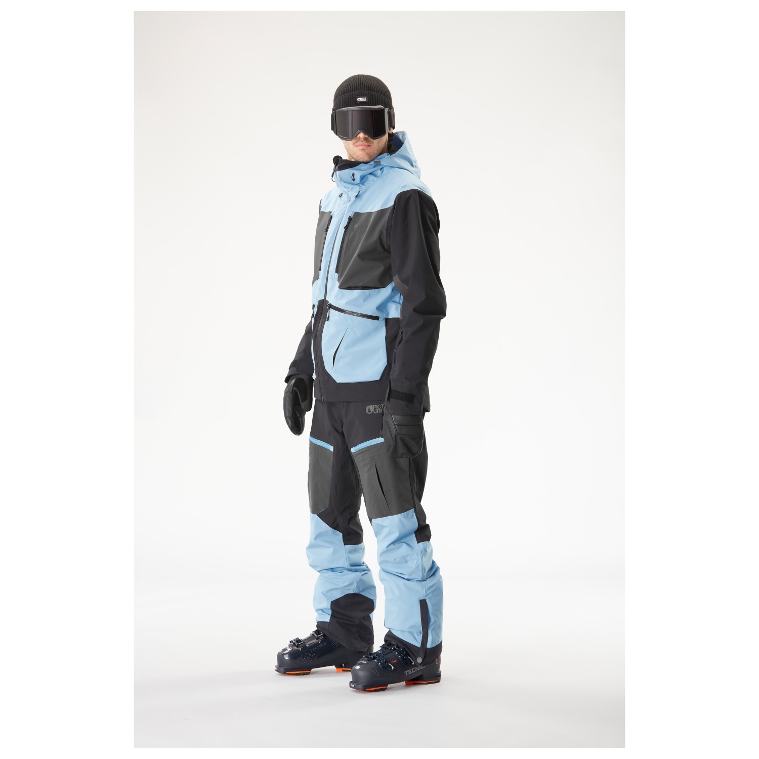 - snölås, jack-byx-anslutningssystem, elastiska innermuddar, tumhål, längre baktill, reglerbar i nederkant, integrerad putsduk för glasögon