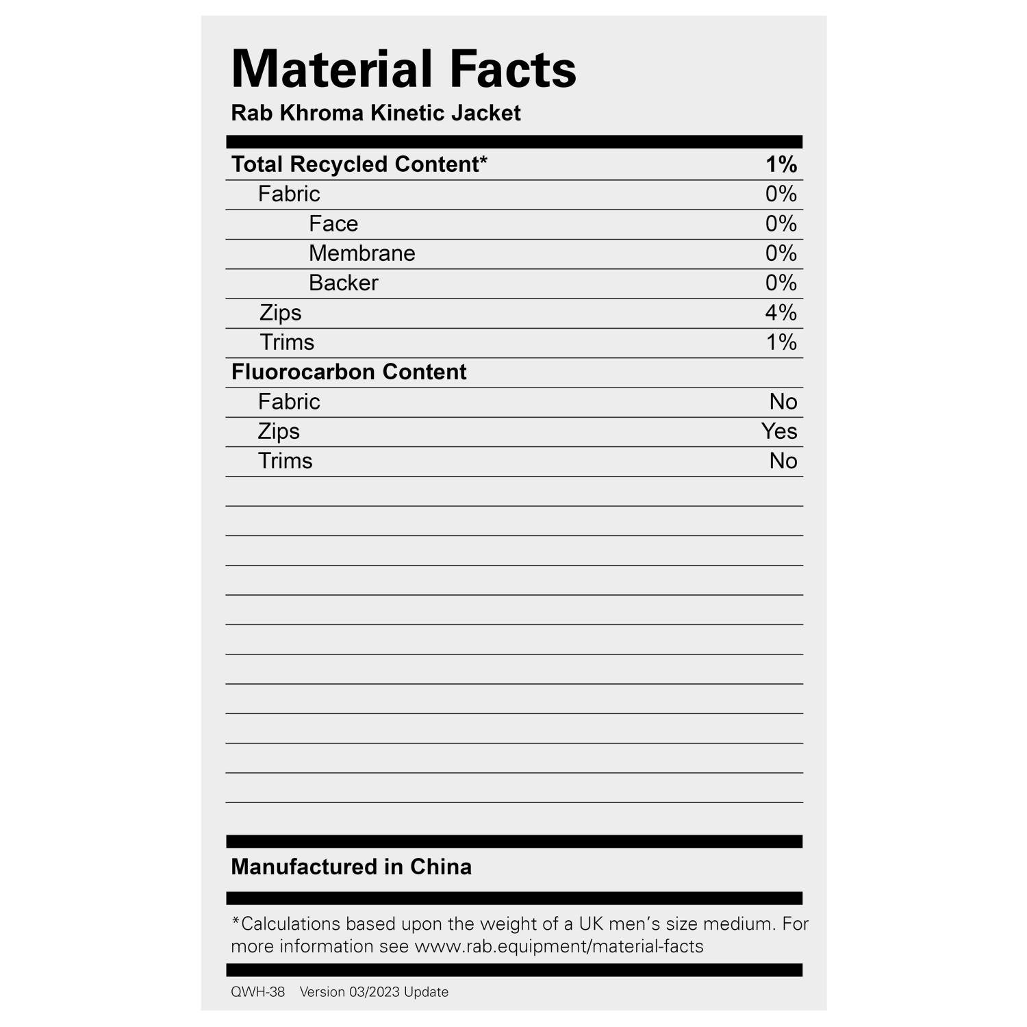 Materialuppgifter & kännetecken