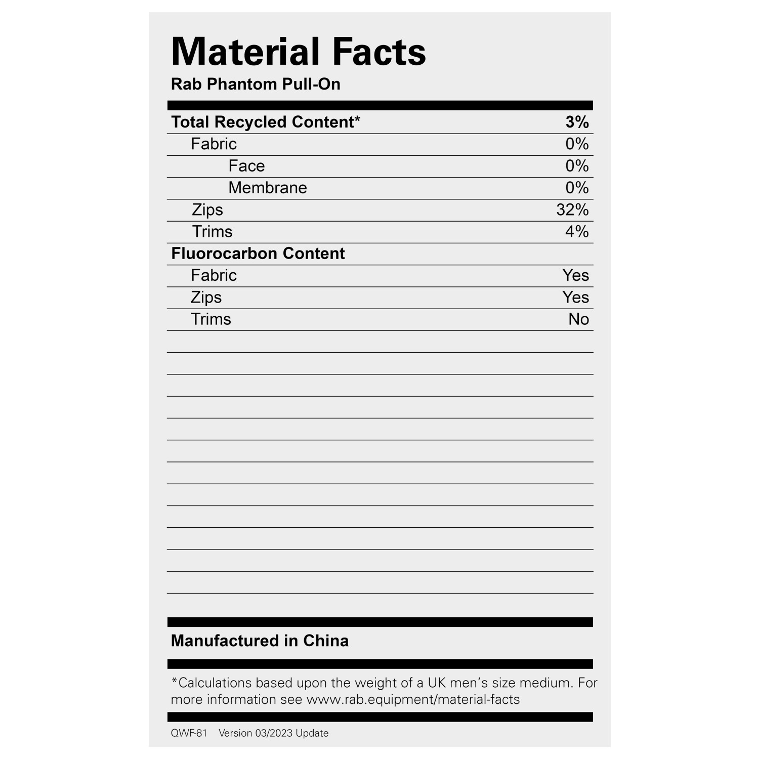 Materialuppgifter & kännetecken