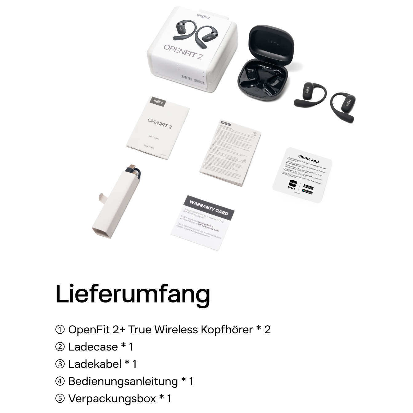 - OpenFit 2+ hörlurar; OpenFit 2+ laddningsfodral; USB-C-till-C-laddningskabel; bruksanvisning