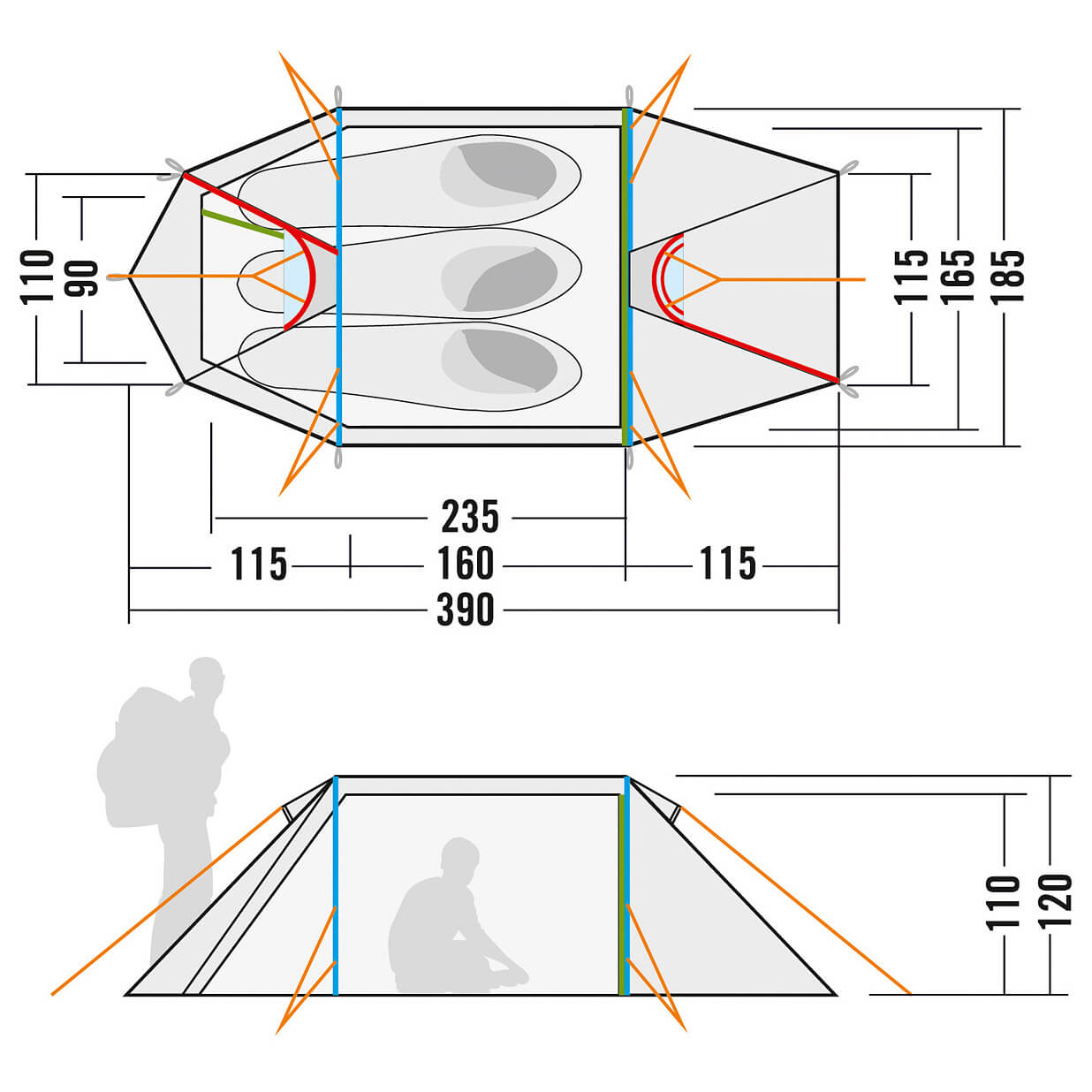 Enkel att montera Bra packningsmöjligheter Flugnät Stormtålig Mycket plats på höjden Vattentät Rymlig