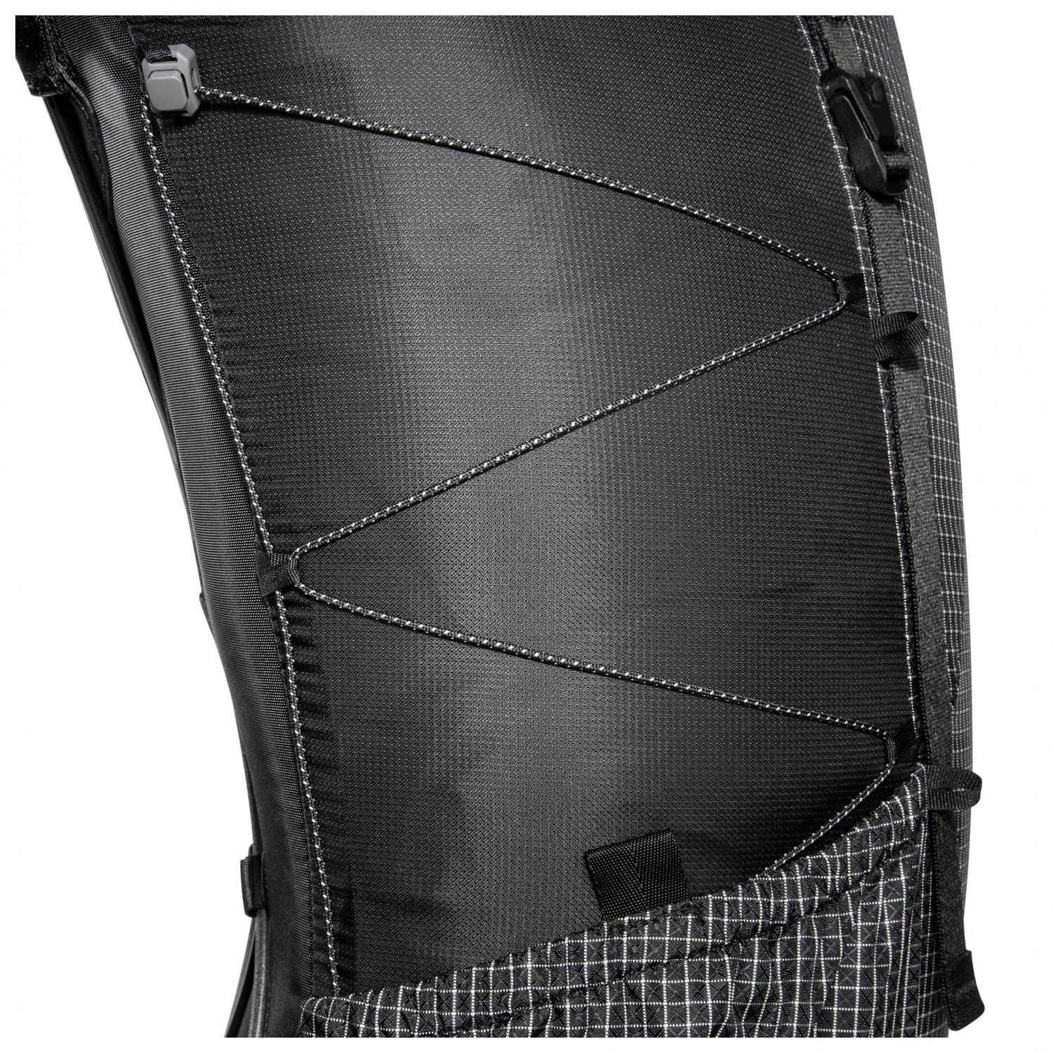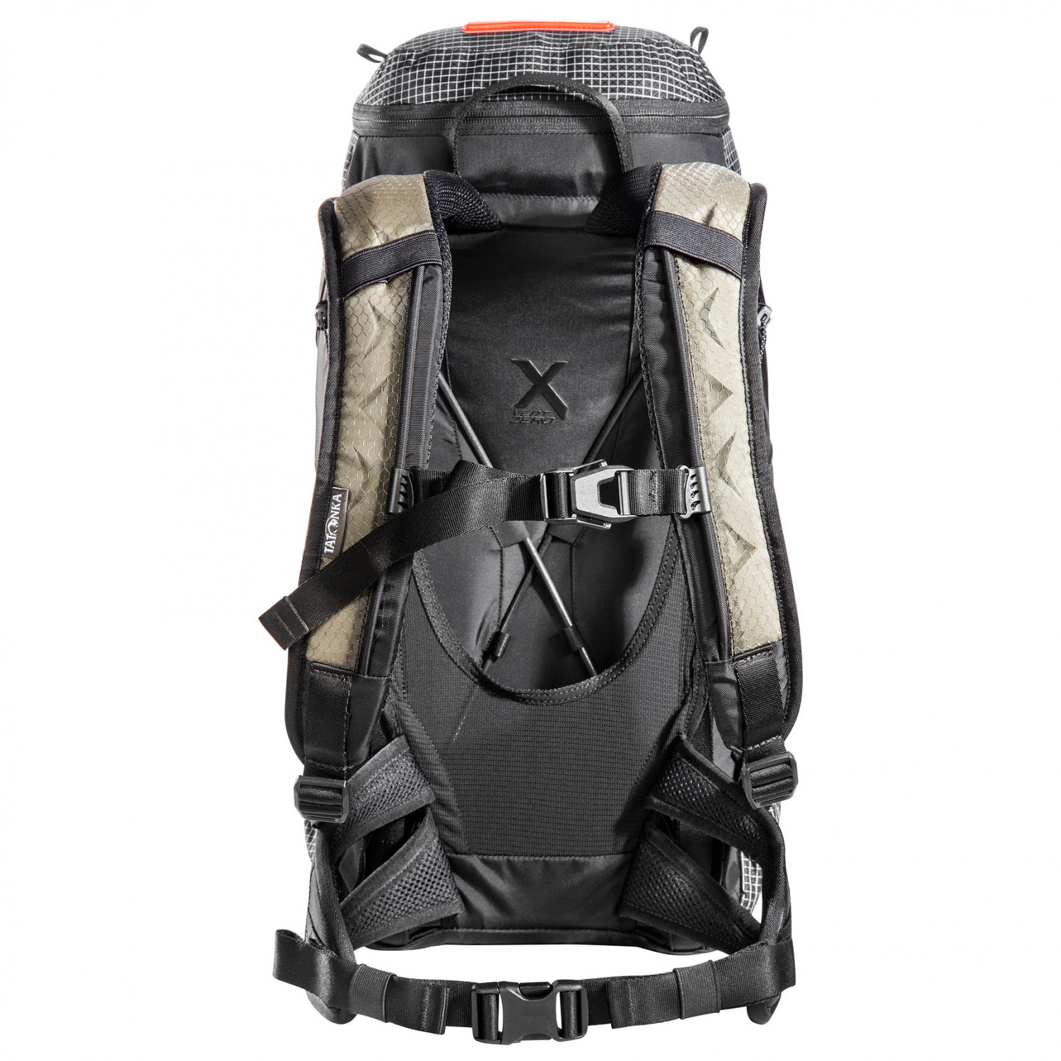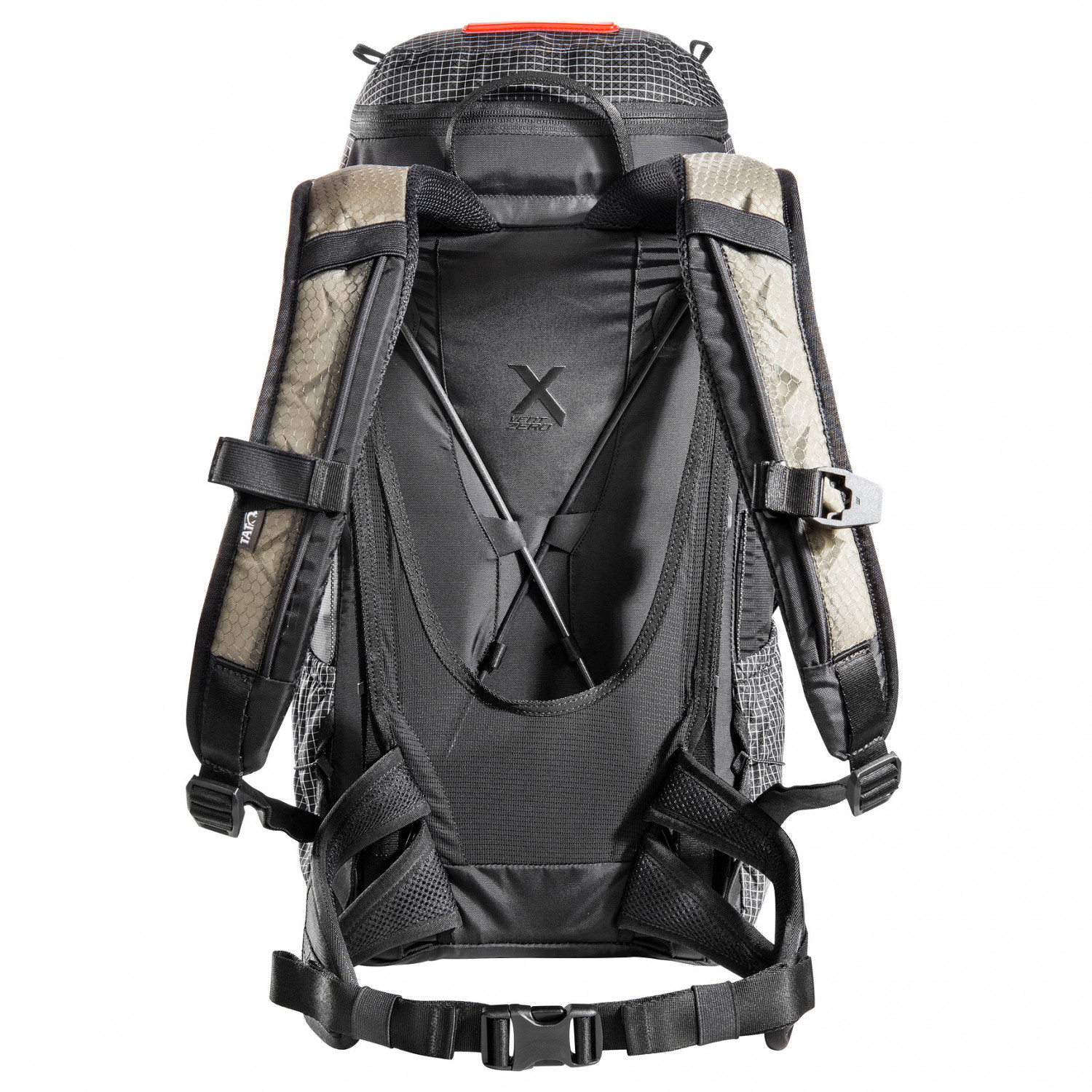 - 2 sidofack, fäste för trekkingstavar, fack med lock, nyckelclip, sidofack