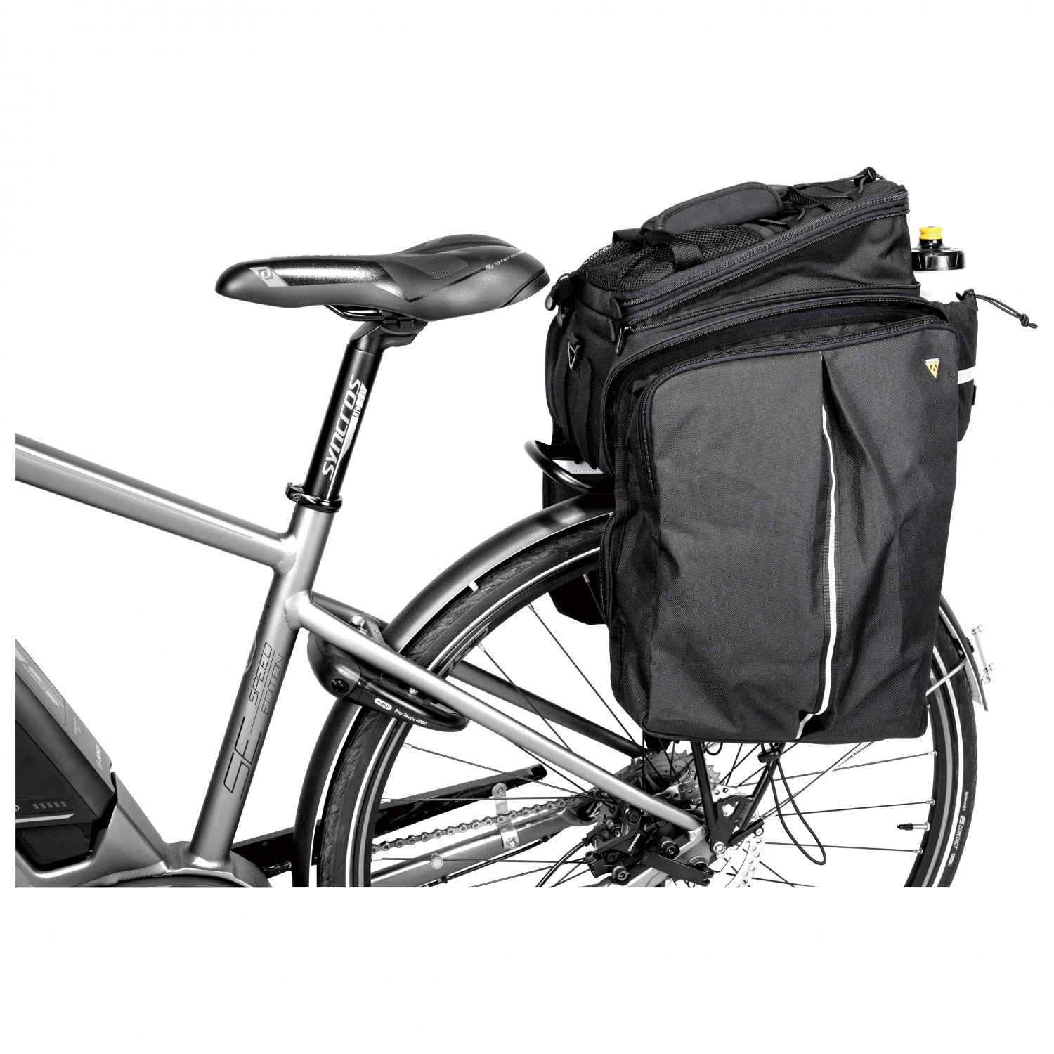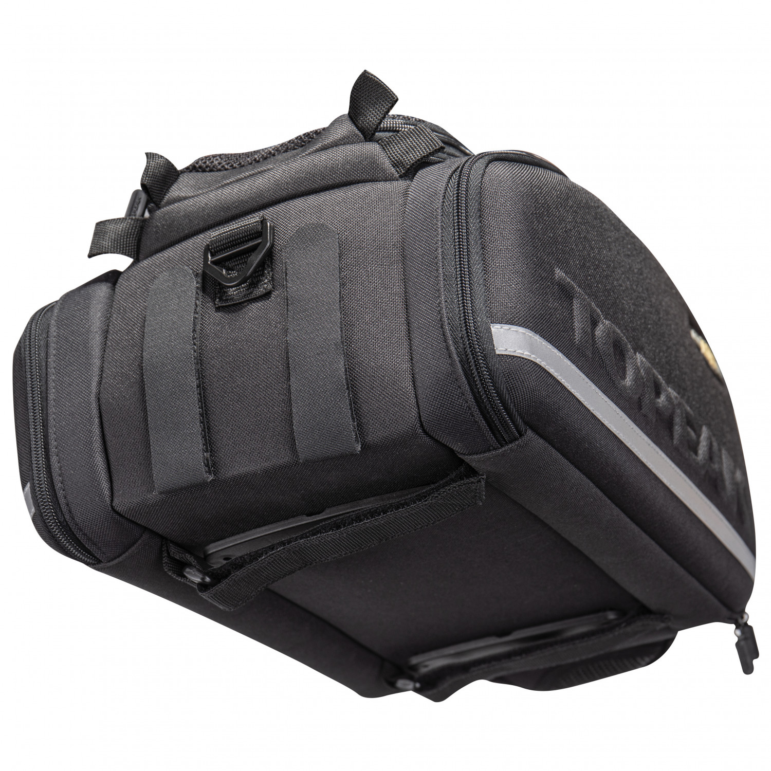 - fastsättning med kardborreband; utfällbara sidofickor; hållare för baklampa