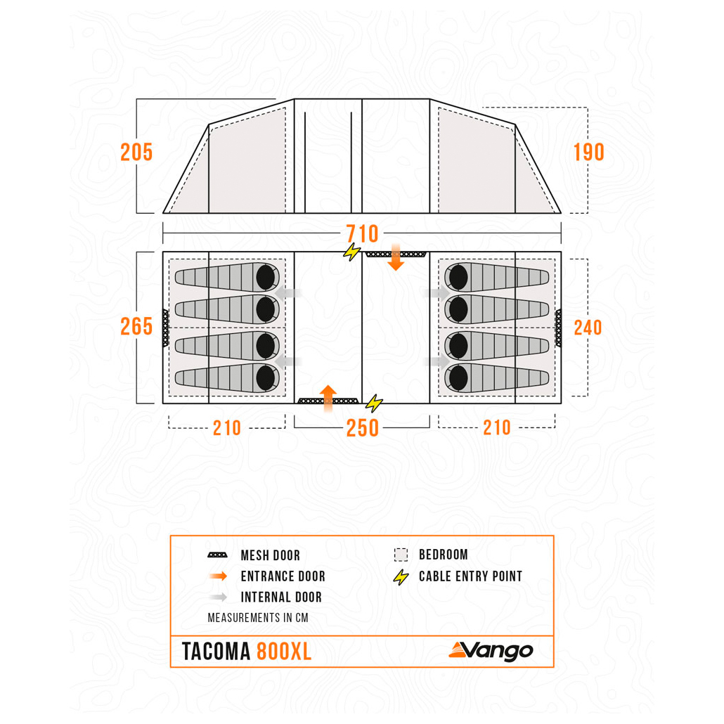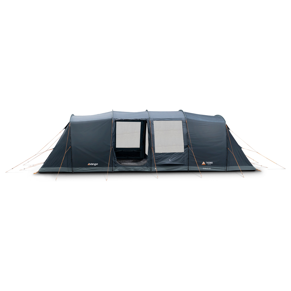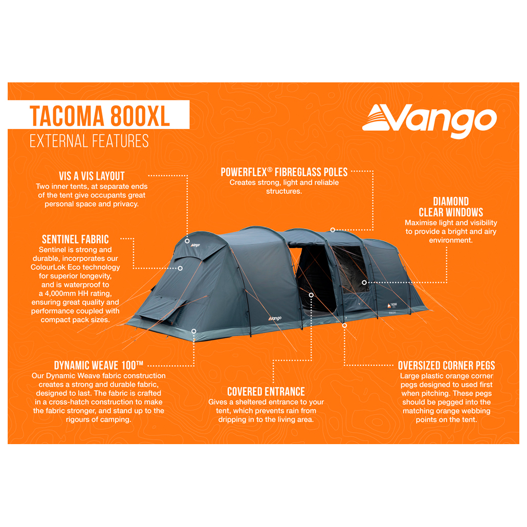 The Tacoma 800XL 8-person tent package from Vango offers plenty of generous space and comfort for all your camping trips. Whether for a group of friends, one large family or two medium-sized families - it can handle it all! This tent features lightweight, sturdy Powerflex® fibreglass poles and boasts two separate sleeping areas at the ends of the tent with a spacious living area in the middle. Both sleeping cabins can be divided again by means of a clip-in partition wall, so that theoretically four cabins for two people each are possible. The integrated ventilation openings improve the air flow so that you always have a pleasant climate in the tent, even in warm weather. Plus, the Dynamic Weave 100™ fabric ensures a small pack size and low weight while guaranteeing the quality and durability you expect from Vango. A cable guide is also included, should you need power.