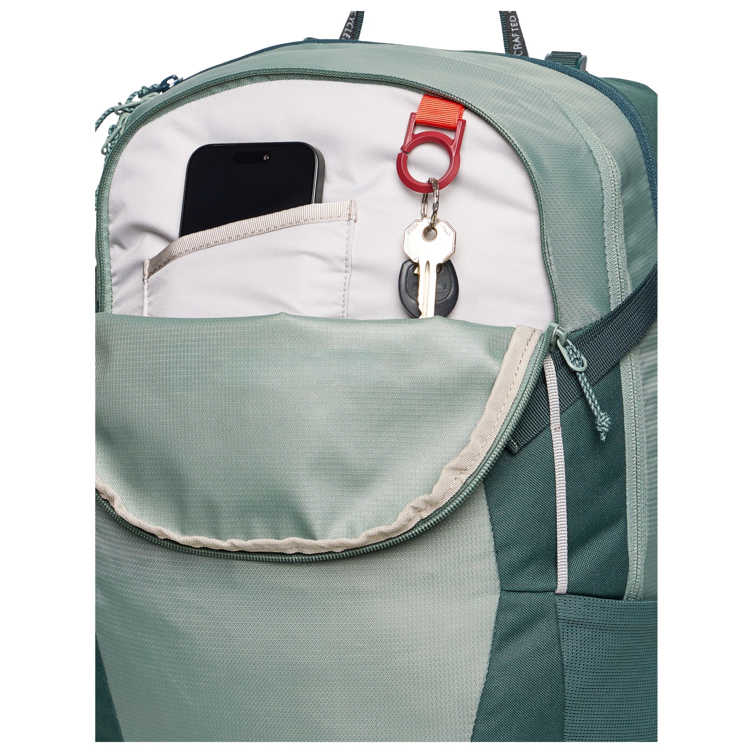 - fickor för höftselar, internt förvaringsfack, glasögonhållare, fäste för trekkingstavar, framficka med blixtlås, 2 sidofack