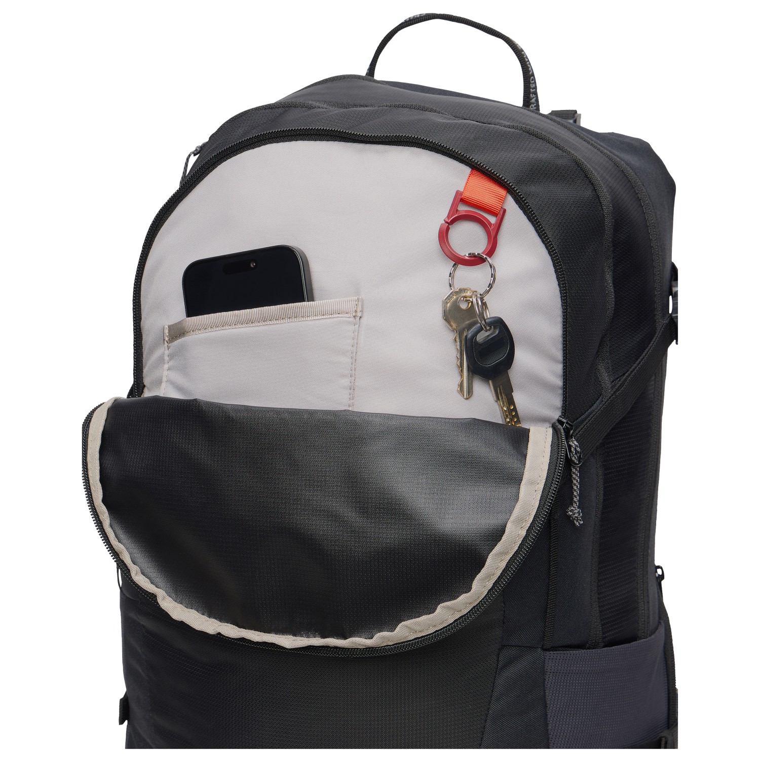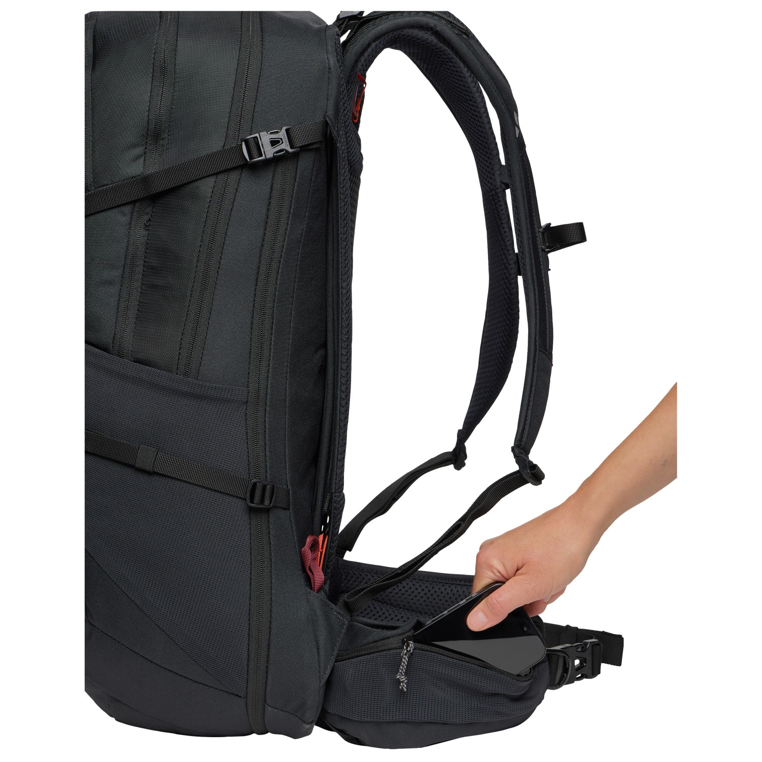 - glasögonhållare, fäste för trekkingstavar, fickor för höftselar, internt förvaringsfack, framficka med blixtlås, 2 sidofack