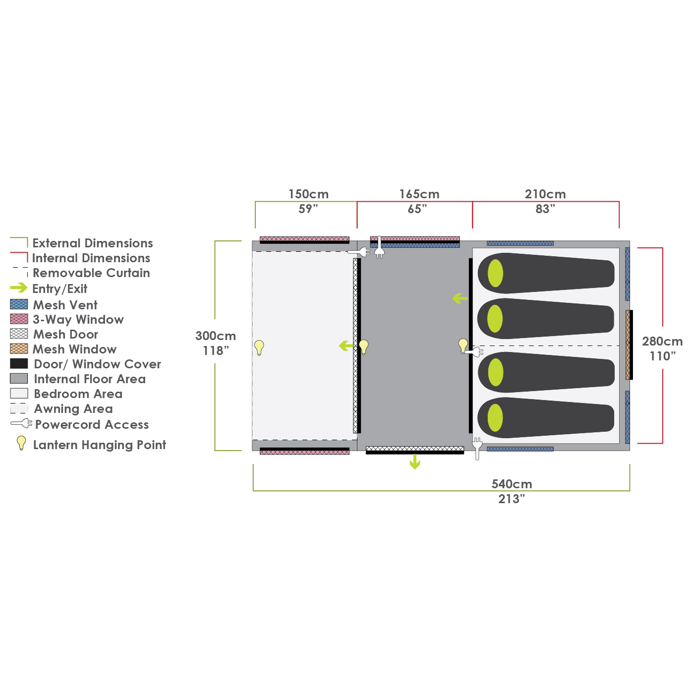 - 12 ventilationspunkter; 5 fönster; med intern boendeyta; med förtält